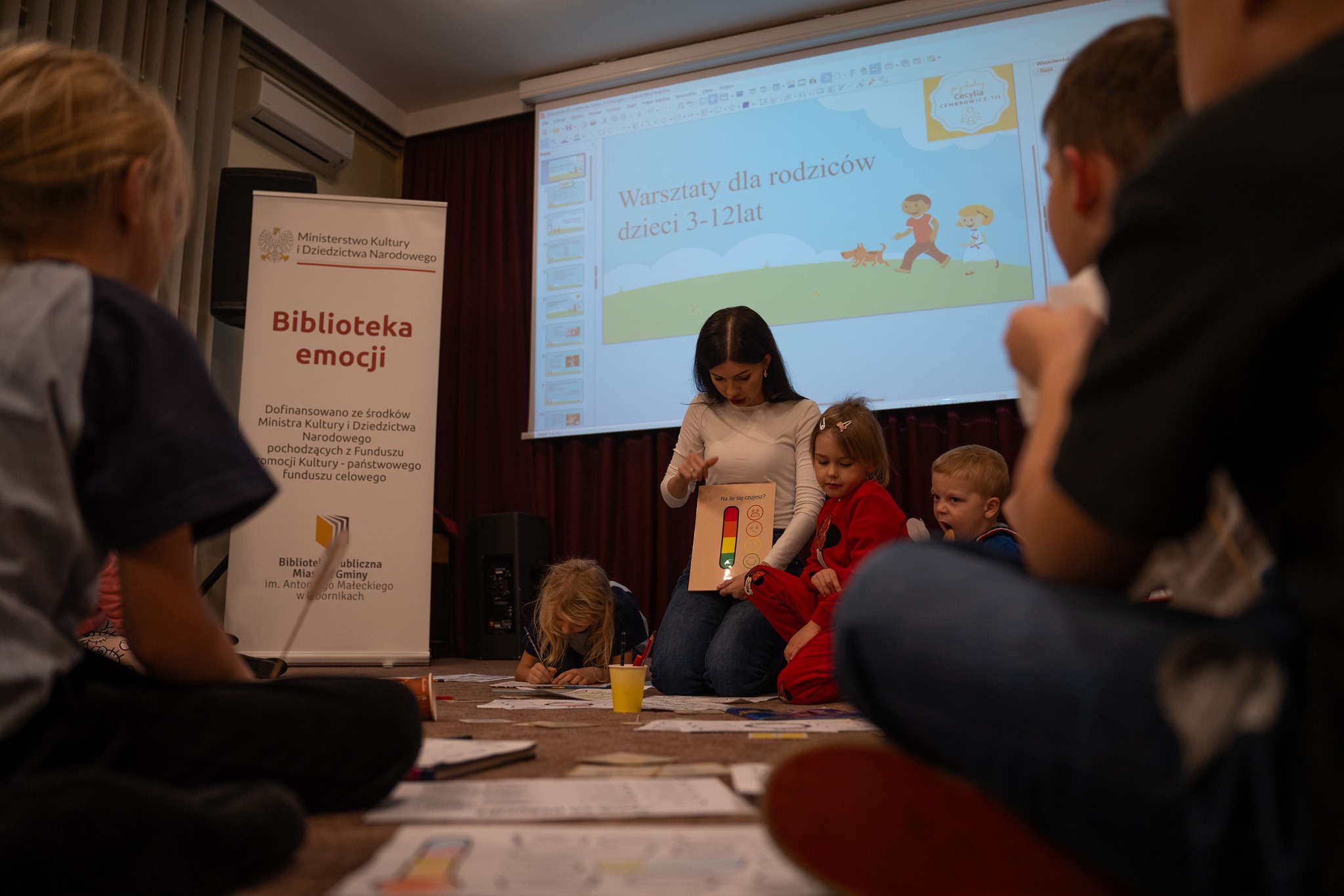 Realizacja projektu pozwoliła nam również zorganizować cykl zajęć warsztatowych prowadzonych przez dyplomowanego psychologa panią Cecylię Cembrowicz-Til (cecyliacembrowicz.pl). Podczas tych zajęć nie tylko polecano książki o emocjach, ale przede wszystkim praktykowano różnorakie metody i sposoby ułatwiające panowanie nad uczuciami. We warsztatach udział wzięli przedstawiciele wszystkich grup wiekowych czyli dzieci, młodzież i dorośli.