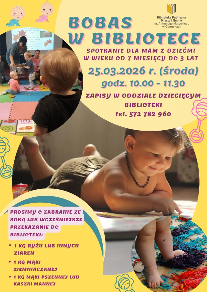 Zapraszamy na kolejne spotkanie w ramach cyklu „Bobas w bibliotece”. Obowiązują zapisy. Szczegóły na plakacie.