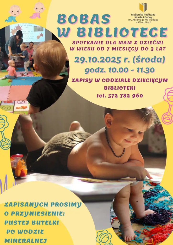 👉 „Bobas w bibliotece” to cykl zajęć dla dzieci w wieku od 7 miesięcy do 3 lat oraz ich opiekunów.