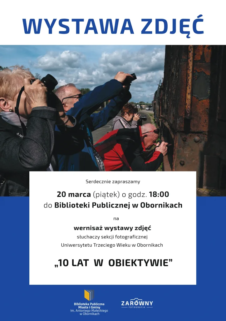 Od 2016 roku, w ramach Uniwersytetu Trzeciego Wieku w Obornikach, działa sekcja fotograficzna prowadzona przez pana Piotra Zarównego. Cieszymy się, że po raz kolejny będziemy mogli podziwiać efekty pasji i pracy słuchaczy UTW na wystawie zatytułowanej „10 lat w obiektywie”. Serdecznie zapraszamy na wernisaż oraz do oglądania ekspozycji w holu biblioteki.